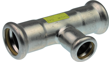 The VSH XPress R2715G is a stainless steel reduced T-piece with 3 press ends, applicable for Gas. Ideal for applications where high levels of hydrogen sulphide make copper an unsuitable material choice. The yellow O-ring and prominent marking on the exterior of this fitting ensure a clear identification of the system.